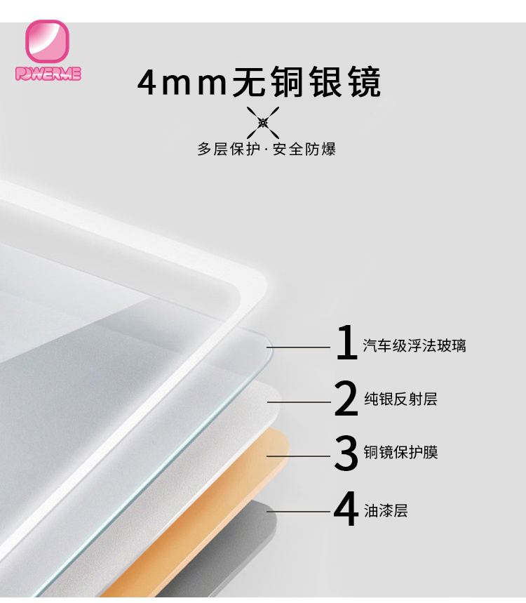 2.環保無銅鏡面,浮化玻璃,帶有拋光邊緣保護手指,4毫米厚度,適用于高濕度位置使用